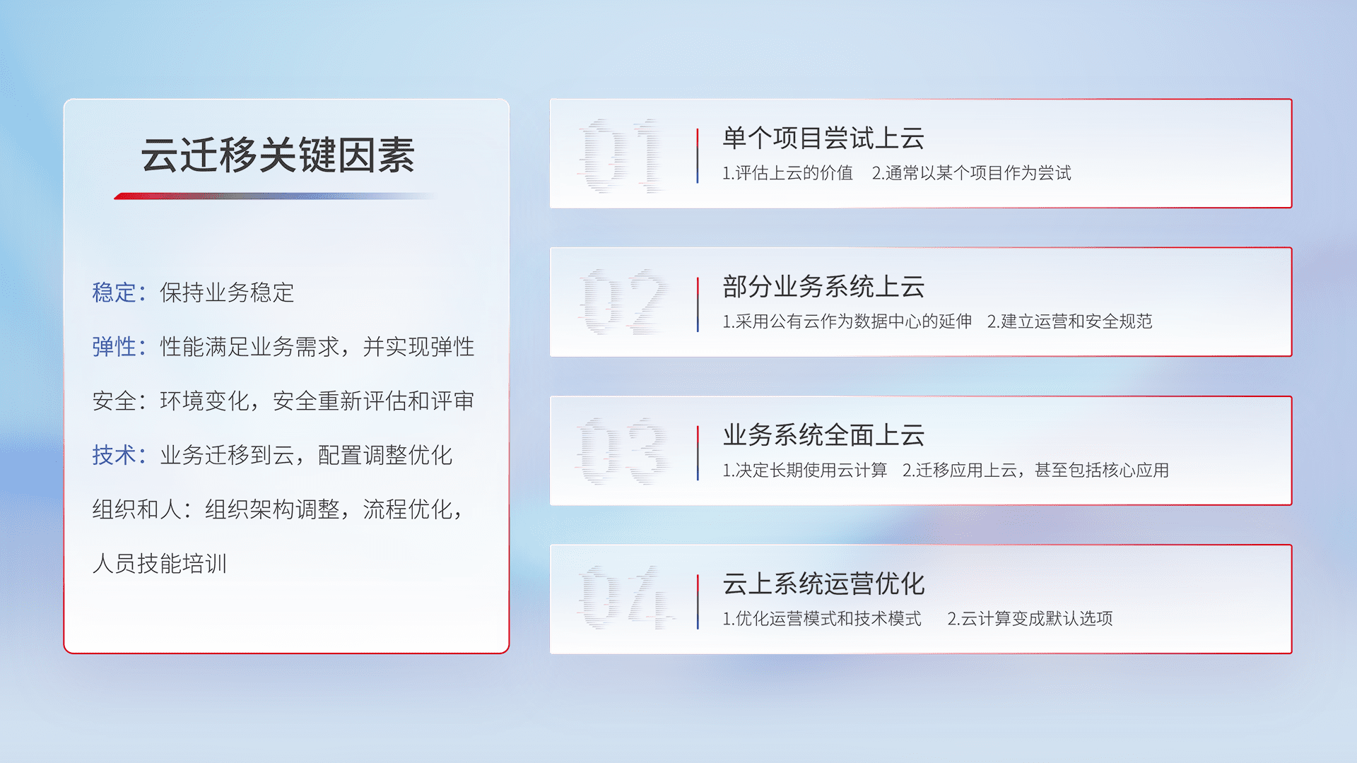 结合实际业务,,从规划设计、、云平台选型、、、云原生改造、、数据迁移、、、、集成交付,,,,迁移全过程为客户识别最佳上云路径,,,,做好风险识别管理,,设计网络架构、、、身份权限、、安全审计合规、、、操作审计、、日志审计、、、监控告警策略、、、多站点容灾设计等,,对云上基础设施进行整体规划,,提升IT治理水平,,,,以满足弹性、、、高可用、、、高性能的需求。。
