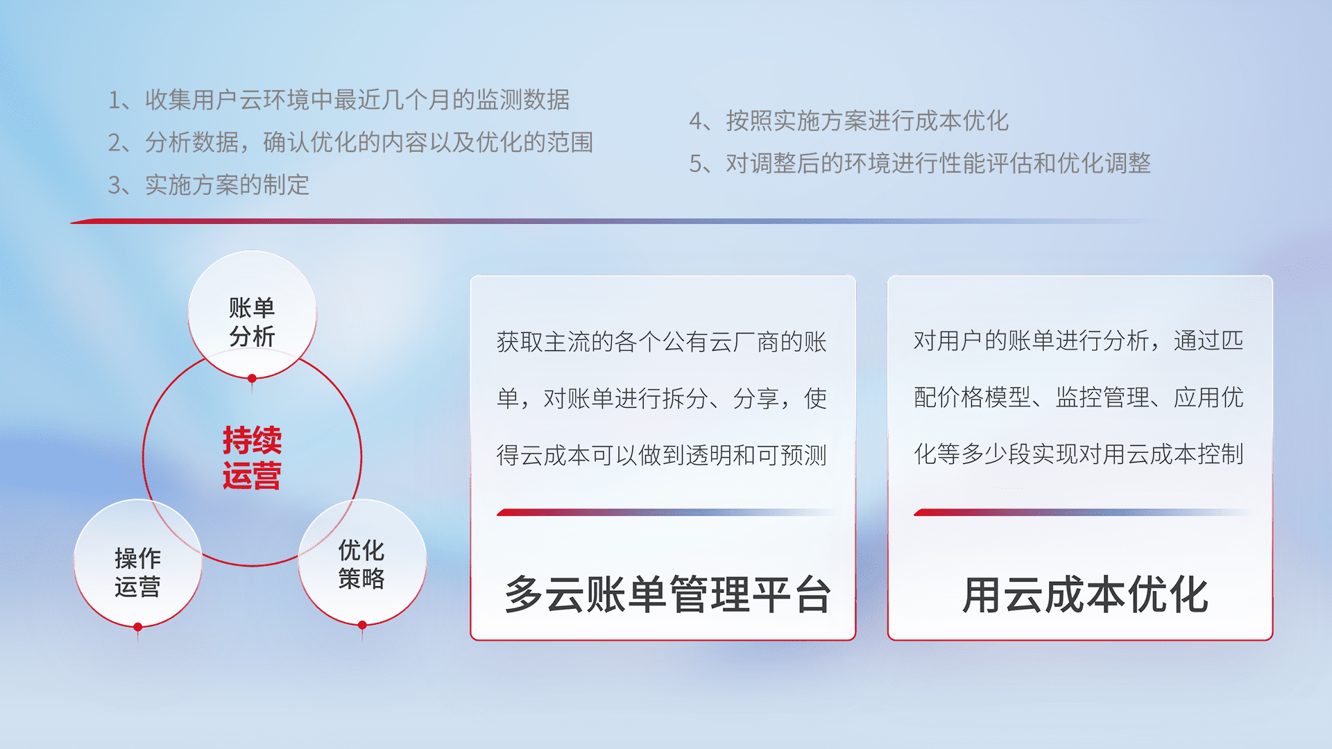 通过多云纳管,,,,以统一的资源数据模型把客户的云资源进行抽象和封装,,,进而实现对多云资源的统一操作,,保障云资源管理的可靠性、、稳定性与可用性。。。量身定制化运维内容,,,,配置、、、、开发运维、、、、补丁管理、、、备份、、、、监控、、认证和访问管理、、、审计和日常巡检等,,,,保障在用云过程中的可靠度,,,稳定度以及高可用率。。